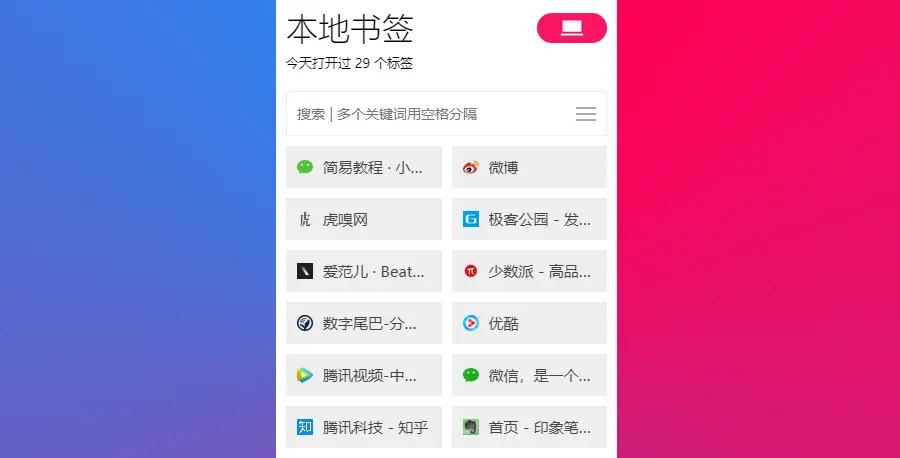 卡片书签是一个浏览器书签扩展,以弹出的方式来呈现书签,不占用网页空间,用完即走,功能大致分为以下几个板块: