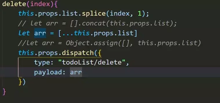 最开始是这么写的,想着是splice是可以改变原数组的,所以将改变后的this.props.list通过dispatch传了过去,但是发现this.props.list更改了,但是页面上的信息并没有删除。