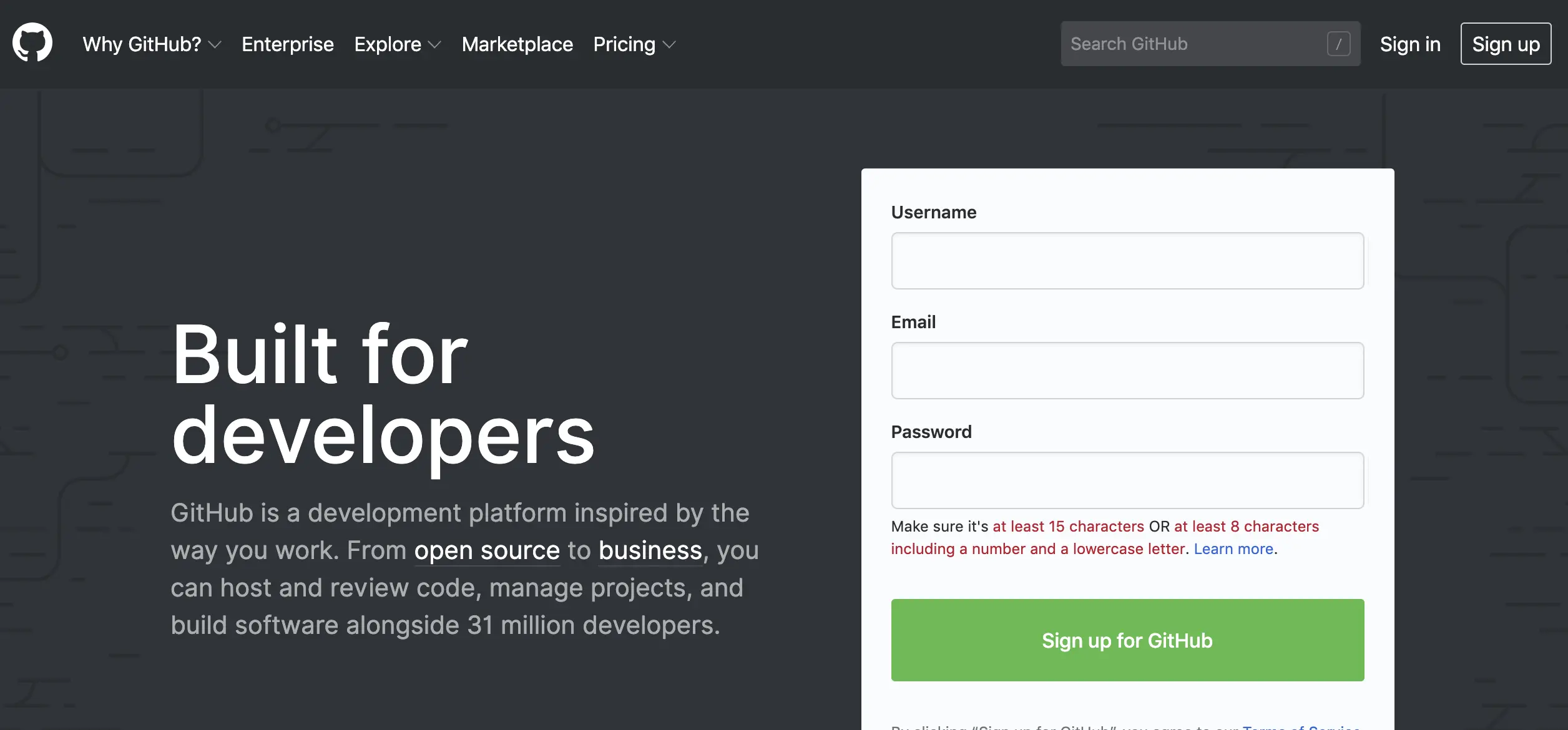 如上图,填写用户名,密码,确认密码后即可进行注册。已经有账号的同学可以直接登录:github.com/login