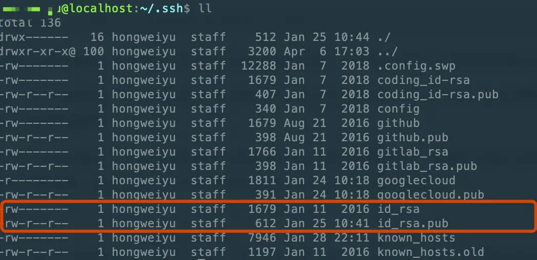 ssh-keygen -t rsa -C "youremail@example.com"输入上述命令后按回车,要求输入一个密语字符串,可以直接回车表示没有密语,接着会让输入2次口令,同样回车按键。最终会执行完毕,执行完毕后,应该在本地机器可以找到两个文件,分别是id_rsa、id_rsa.pub文件。windows系统下两个文件的位置在[c盘>用户>自己的用户名>.ssh]目录下已经生成好了;macOS系统下面,在系统用户目录下有.ssh目录中,也有id_ras和id_rsa.pub两个文件。这里仅列出macOS目录下的文件截图:
