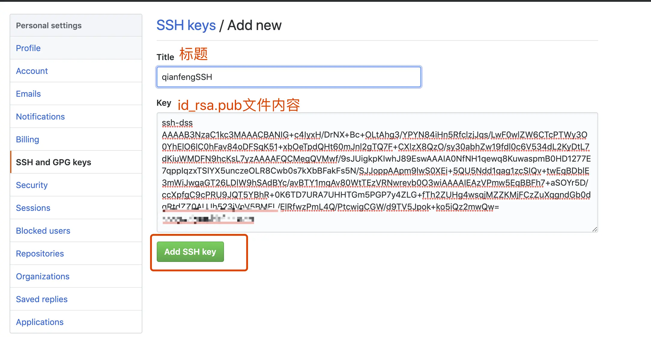 2、打开已经登录的github,打开setting -> SSH Keys,点击右上角New SSH Key,把第一步生成的两个文件中的其中一个id_rsa.pub内容放入到输入框中,并为该ssh key命名。