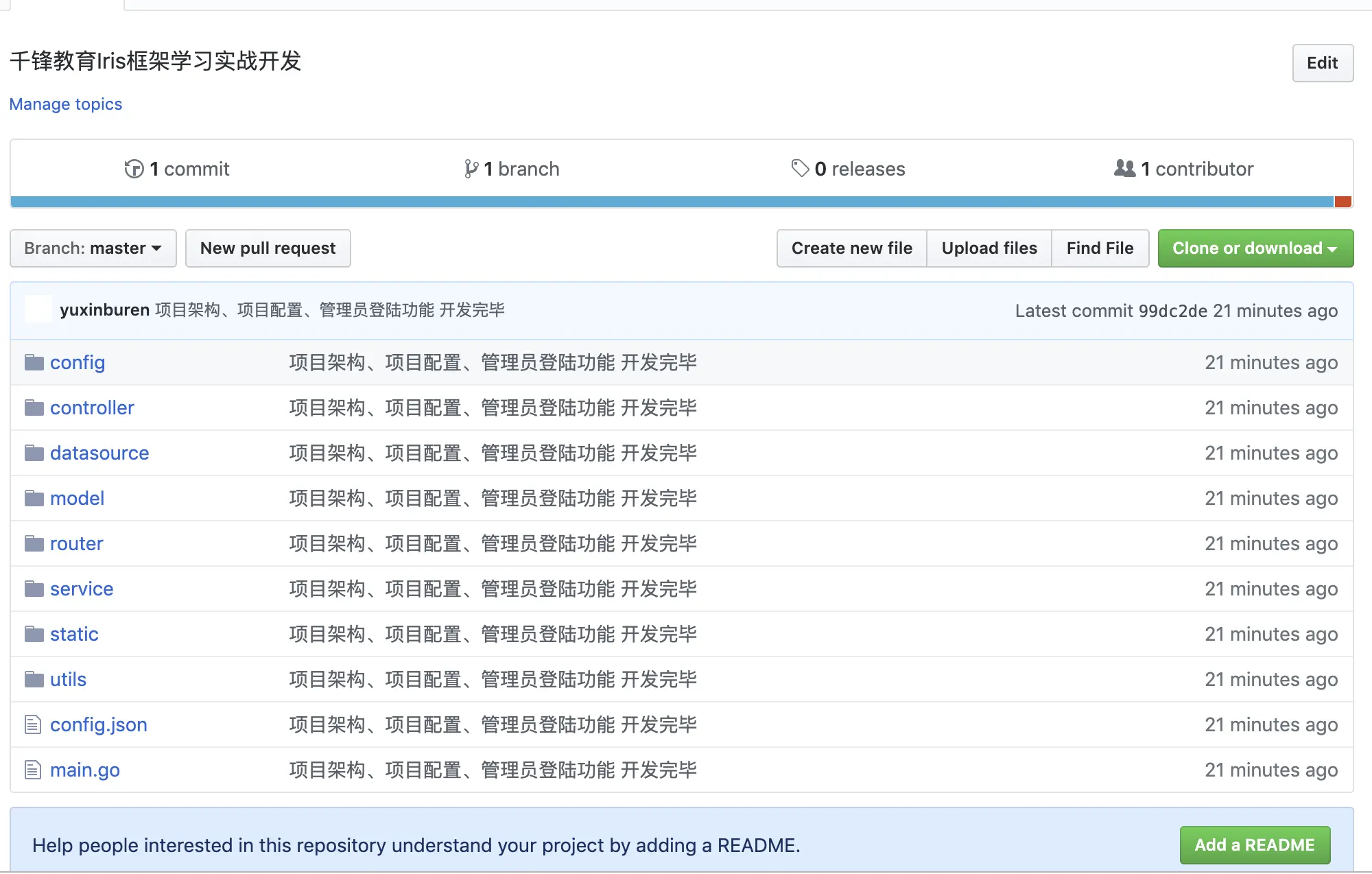 git init本地提交项目代码 之前我们搭建项目架构、进行项目配置,并开发完成的管理员登陆功能,代码开发已经进入正轨。因此,我们有必要每开发完成一个小功能,就提交一次我们的代码,以达到能够实时跟踪并保存我们的项目代码的目的。在git中,将已经开发完成的代码提交到仓库需要两个步骤:第一个步骤是将代码提交到本地,第二步是推送到远端仓库,在我们这个系列课程中的远端仓库就是我们在github上已经创建的仓库。 首先,我们来看第一步,将代码提交到本地。这一步骤需要使用commit命令,具体命令如下: