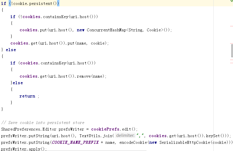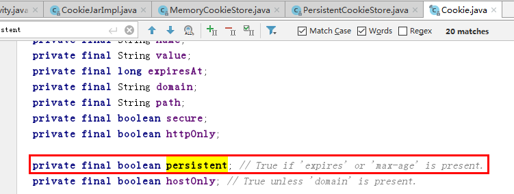 从源码上可以看出,当请求头中存在expires和max-age时,返回为True,这个时候PersistentCookieStore是不对Cookie进行磁盘、内存存储的,这里只是设置一个Cookie的有效期,此时Cookie值并没有过期。