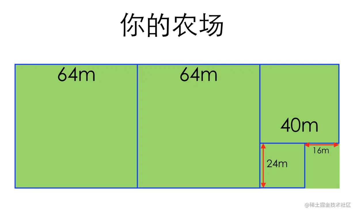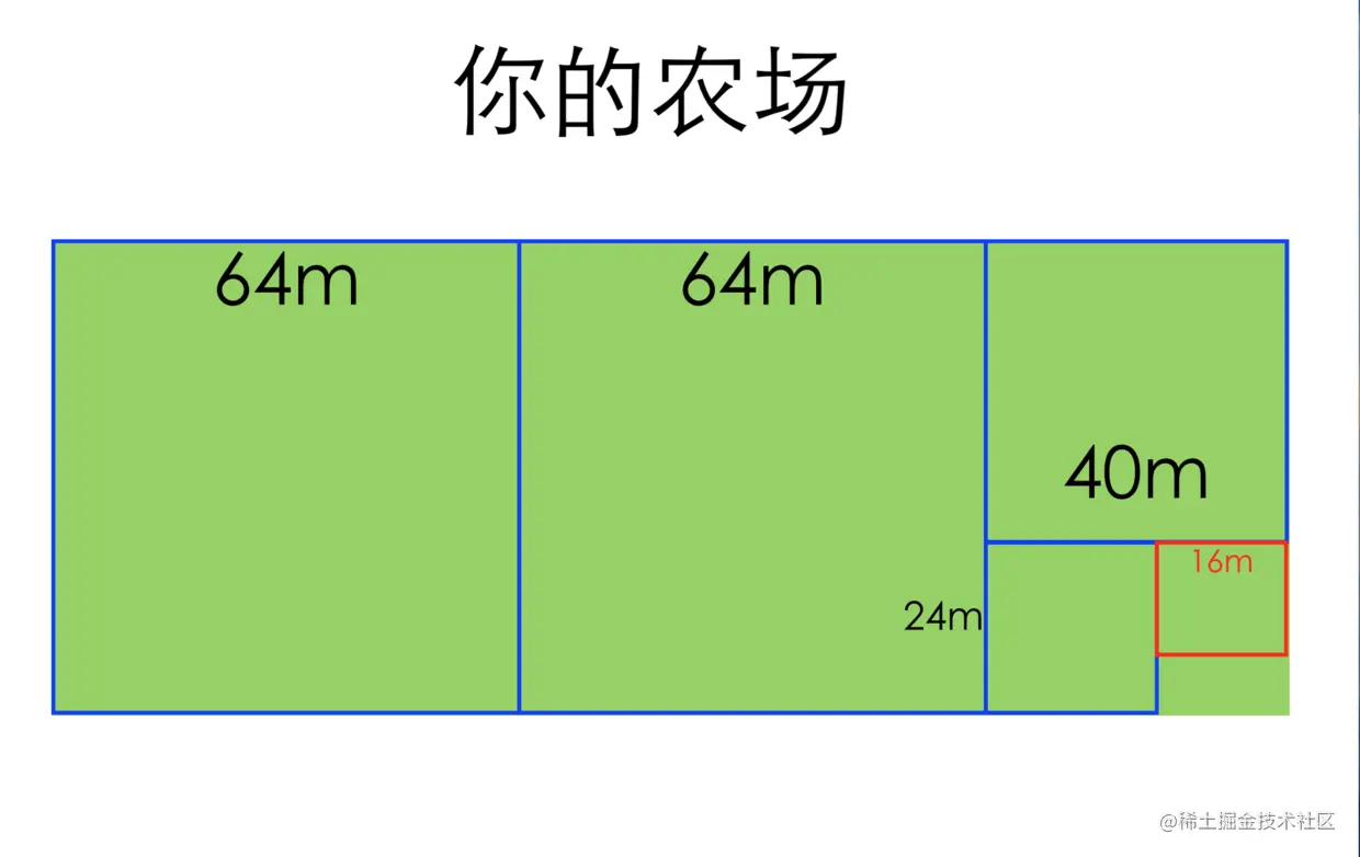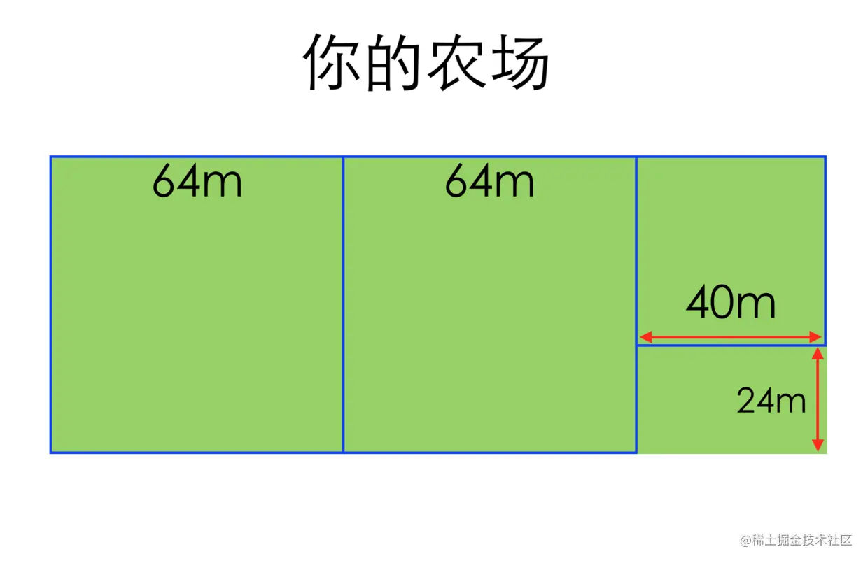 第二次:找到一个边长为40m的小正方形,去除后,留下40m x 24m的小长方形。