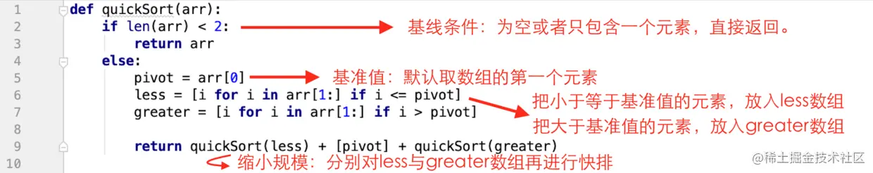 - 基线条件:当排序数组元素个数小于2个时,直接返回。