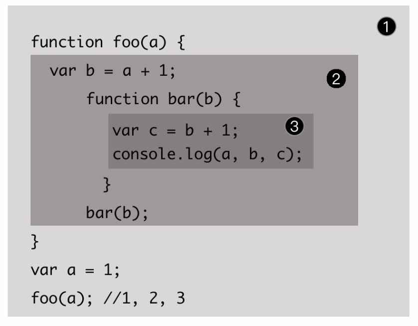- 2中包含foo所创建的作用域,其中有两个标识符b,bar。