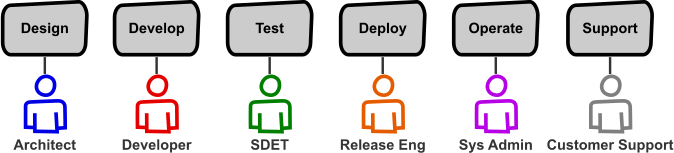 These specialized roles create efficiencies within each segment while potentially creating inefficiencies across the entire life cycle. Specialists develop expertise in a focused area and optimize what’s needed for that area. They get more effective at solving their piece of the puzzle. But software requires the entire life cycle to deliver value to customers. Having teams of specialists who each own a slice of the life cycle can create silos that slow down end-to-end progress. Grouping differing specialists together into one team can reduce silos, but having different people do each role adds communication overhead, introduces bottlenecks, and inhibits the effectiveness of feedback loops.