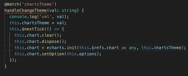 - 监听该主题名字, 并且重新init--echarts实例(这里clear, dispose是为清除上一次图表的绘制, 否则显示的还是上一个主题)