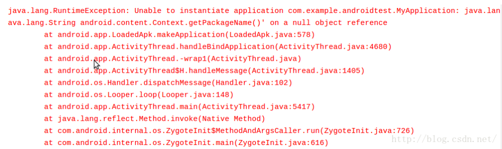 这是一个非常简单的自定义Application,我们在MyApplication的构造方法当中获取了当前应用程序的包名,并打印出来。获取包名使用了getPackageName()方法,这个方法就是由Context提供的。那么上面的代码能正常运行吗?跑一下就知道了,你将会看到如下所示的结果: