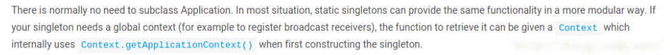 以上是我们平时在使用Application时需要注意的一个点,下面再来介绍另外一种非常普遍的Application误用情况。 其实Android官方并不太推荐我们使用自定义的Application,基本上只有需要做一些全局初始化的时候可能才需要用到自定义Application,官方文档描述如下: