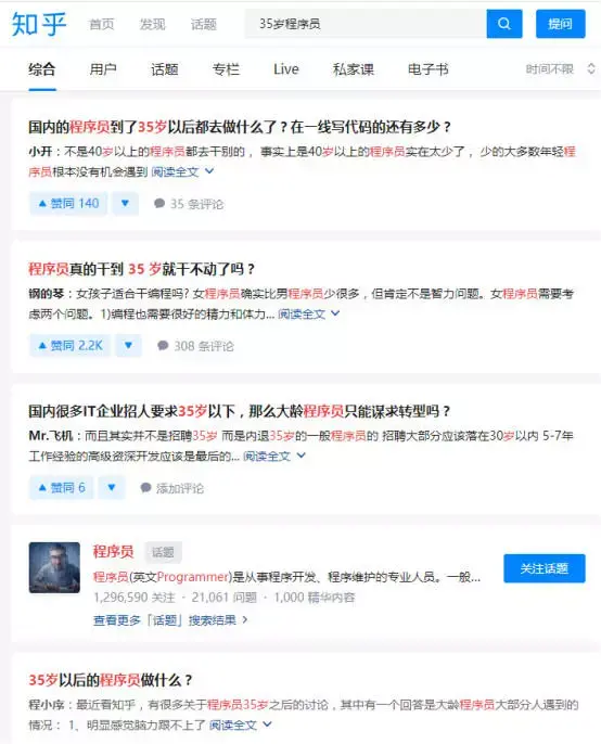 在知乎里输入“程序员,35岁”,得出的搜索结果竟然惊人的一致。看来,对于程序员35岁之后的生存现状,大家都持有一种观望和无奈。