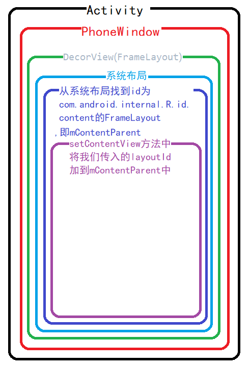第一个省略号处通过很多判断后从系统的布局文件中选了一个inflate成一个View,加到了DecorView中,而返回的contentParent就是从布局文件中找到id为ID_ANDROID_CONTENT(com.android.internal.R.id.content)ViewGroup返回,其实也是一个FrameLayout