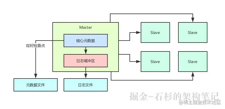 对,所以针对这个问题,既然已经否决掉了基于外部存储来写入元数据,那么这里就可以采取异步持久化日志的机制,来通过异步化的方式把元数据的更新日志写入磁盘文件。
