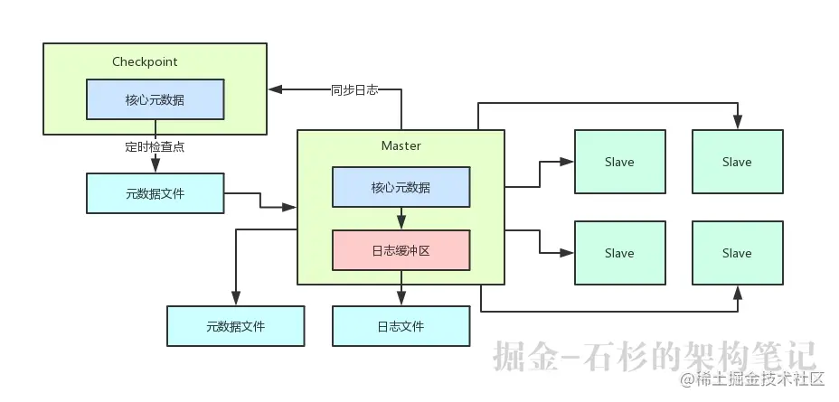 这种方式,可以让Master重启很快,因为大部分数据都是在检查点写入的那个元数据文件里。