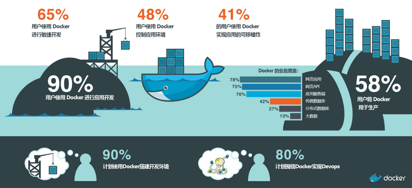 对于按需部署或部署到云环境,Docker 提供了独一无二的选择。 80% 的用户表示 Docker 已经成为他们云策略的一部分,超过 35% 的用户使用 Docker 来避免被云服务供应商绑定。