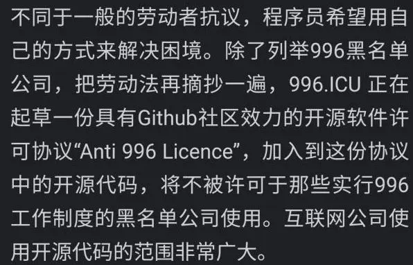所以这个“Anti 996 Licence”的协议如果一旦推广,还是非常有威慑力,至少没有哪家公司会公开宣称把996制度化了。最简单的一点,万一公司的代码里涉及到了“Anti 996 Licence”,会给公司商务找上无穷无尽的麻烦。