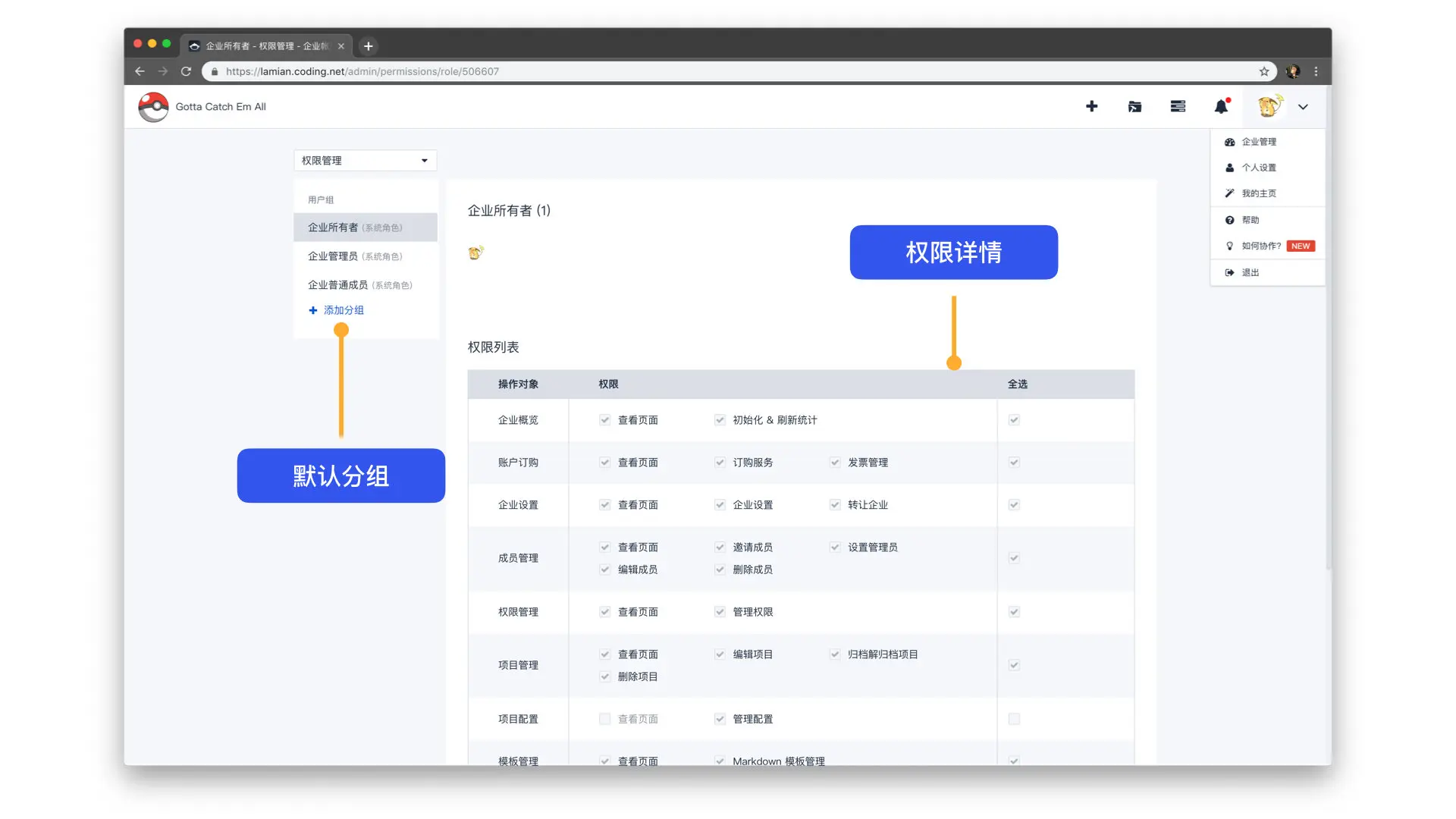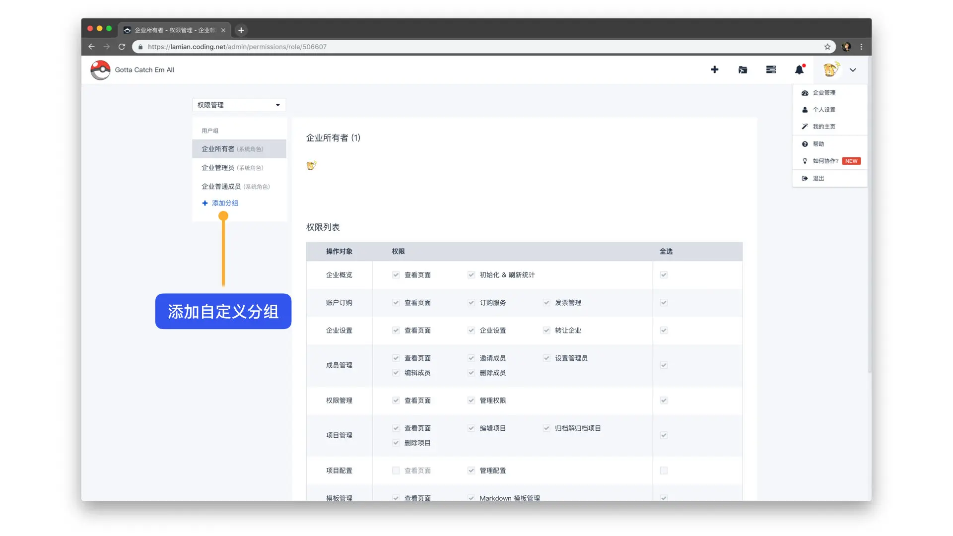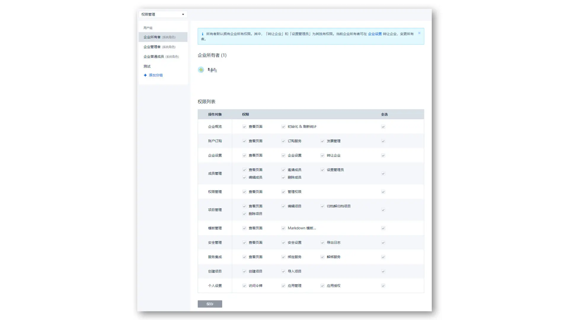企业所有者可编辑企业管理员、企业普通成员、自定义用户组的权限。