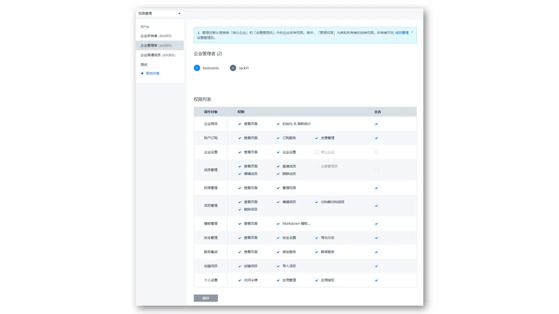 可在【企业管理】->【权限管理】中看到企业管理员所拥有的权限。