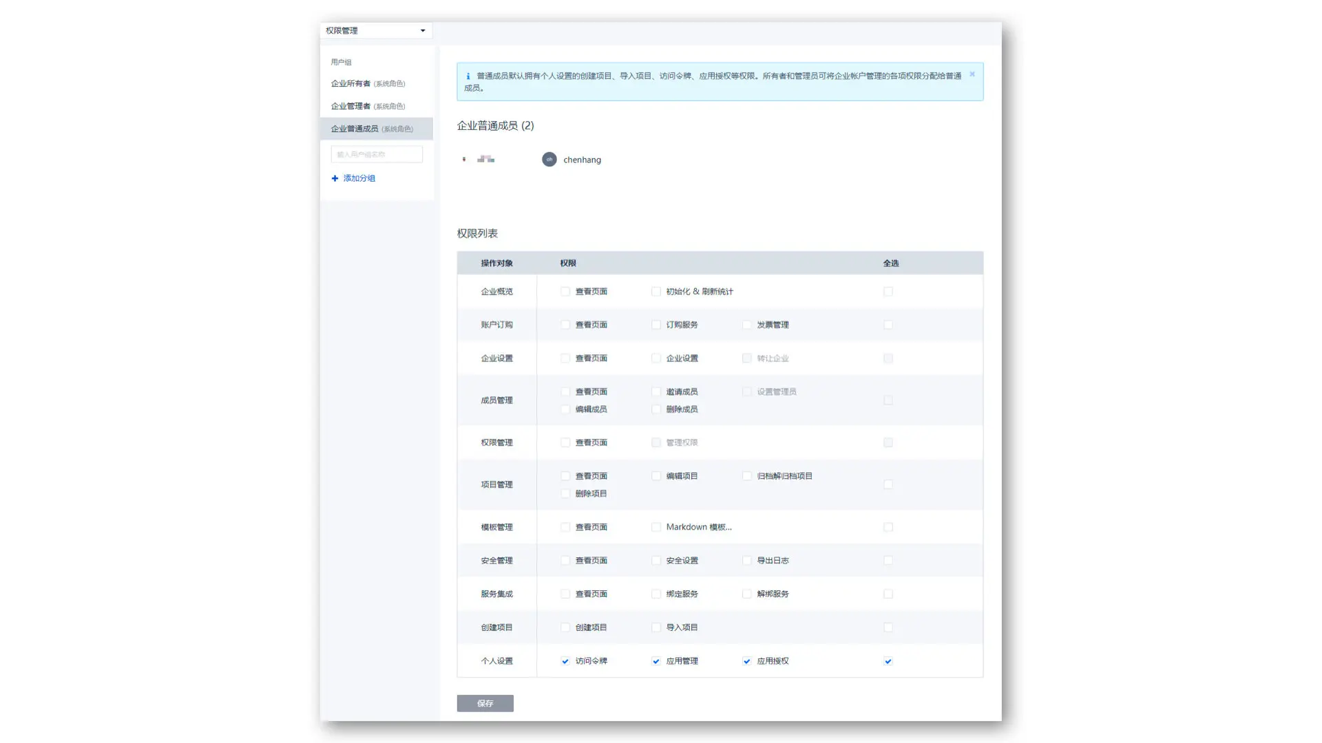 企业普通成员默认拥有【个人设置】选项中 “创建项目、导入项目、访问令牌、应用授权“ 等权限。企业所有者/管理员可将企业各项权限分配给普通成员,并支持对其权限进行编辑。