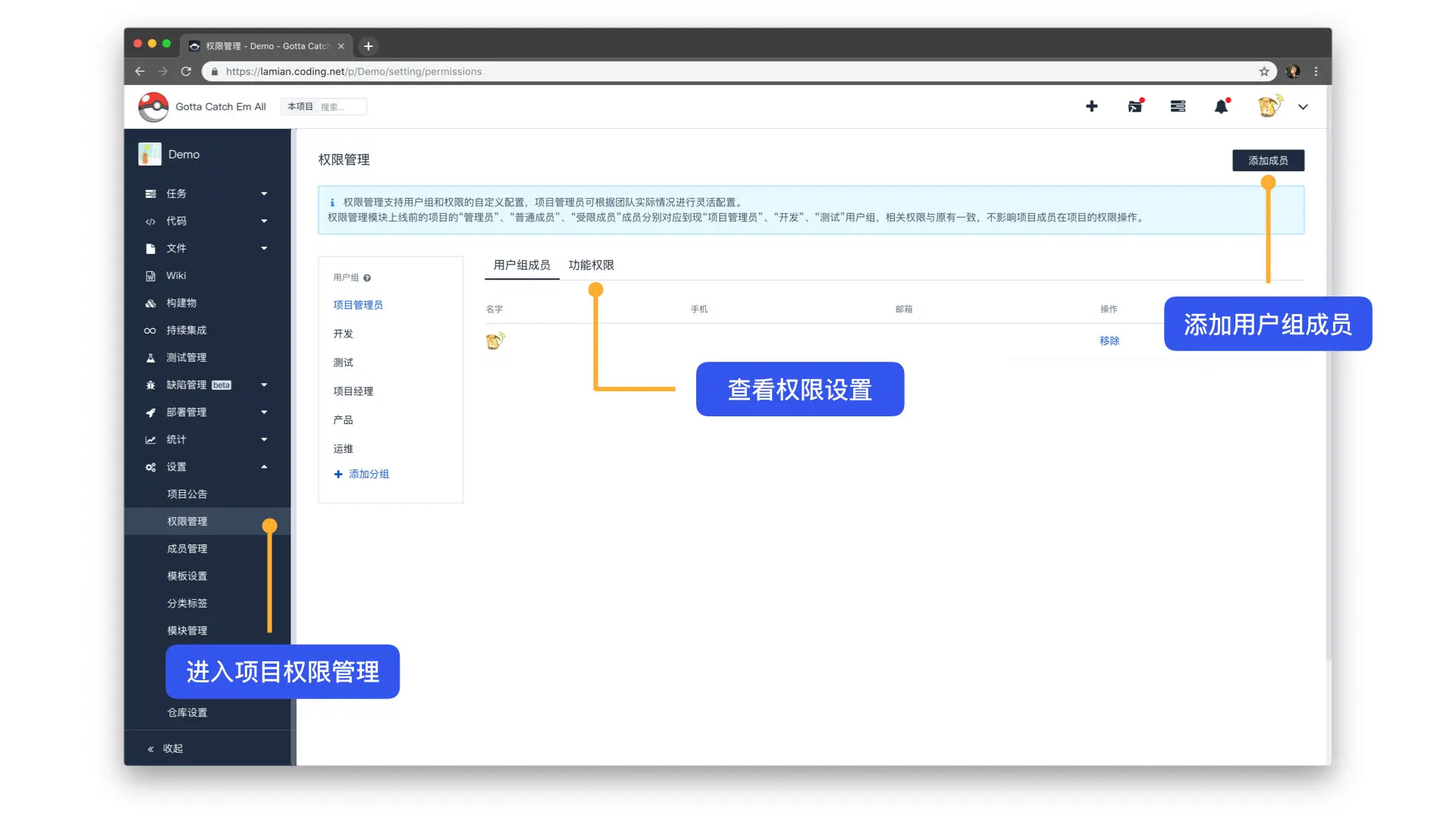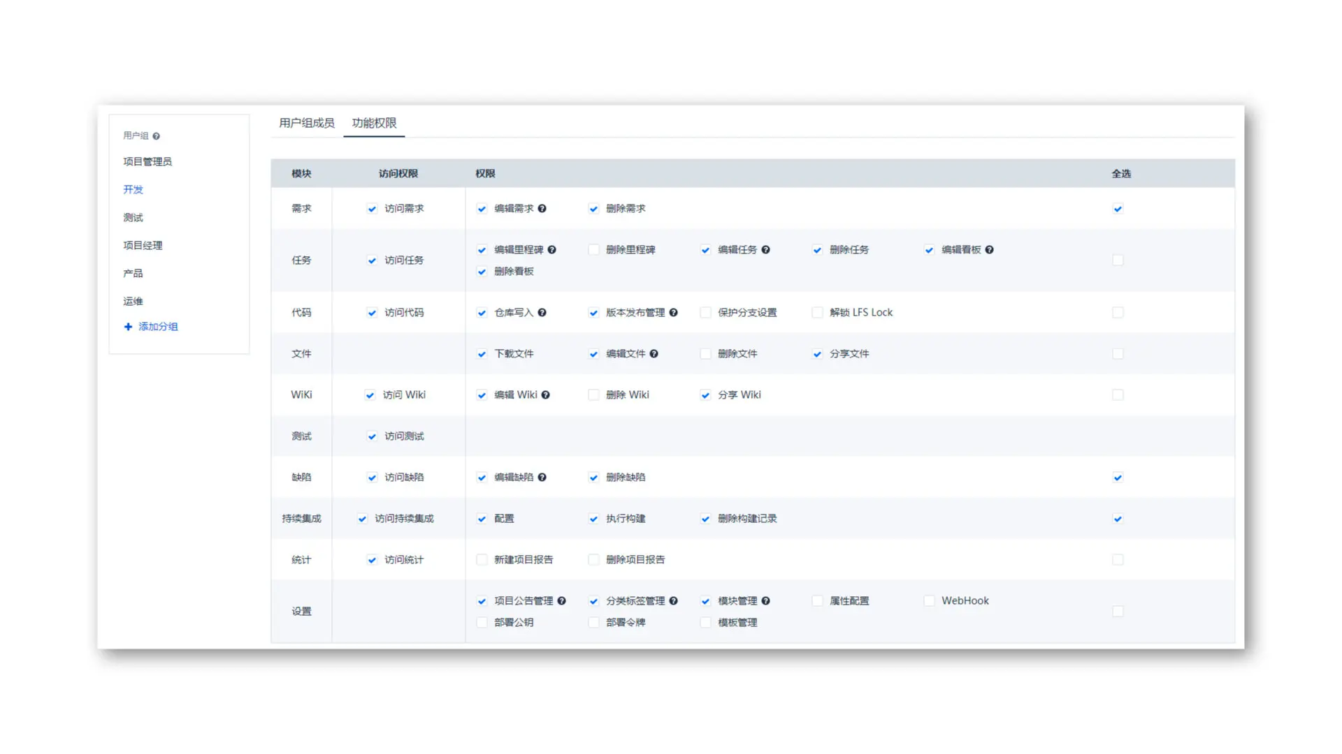 - 原项目的“管理员”、“普通成员”、“受限成员”分别对应现“项目管理员”、“开发”、“测试”用户组,相关权限与原有一致,不影响项目成员在项目的权限操作。