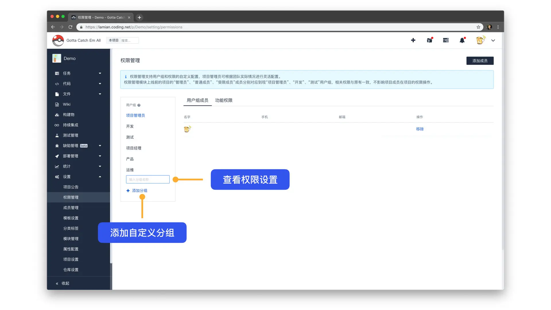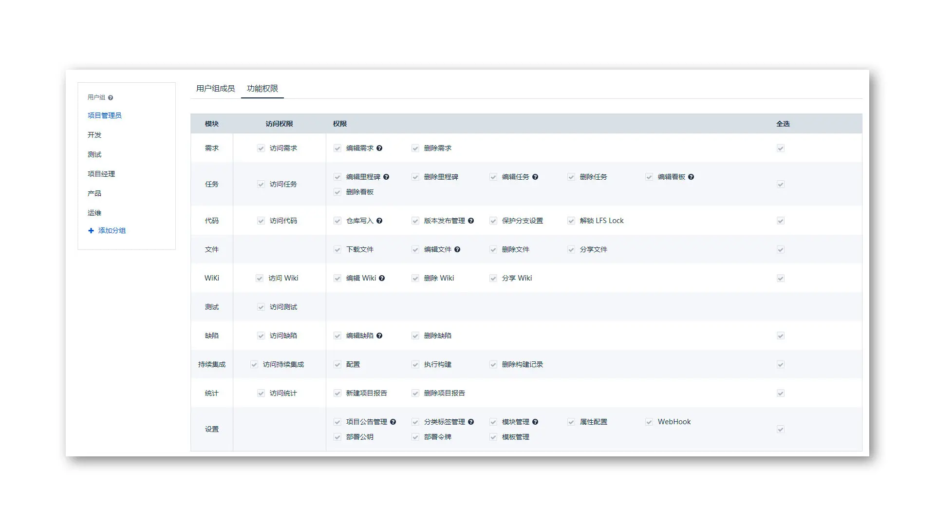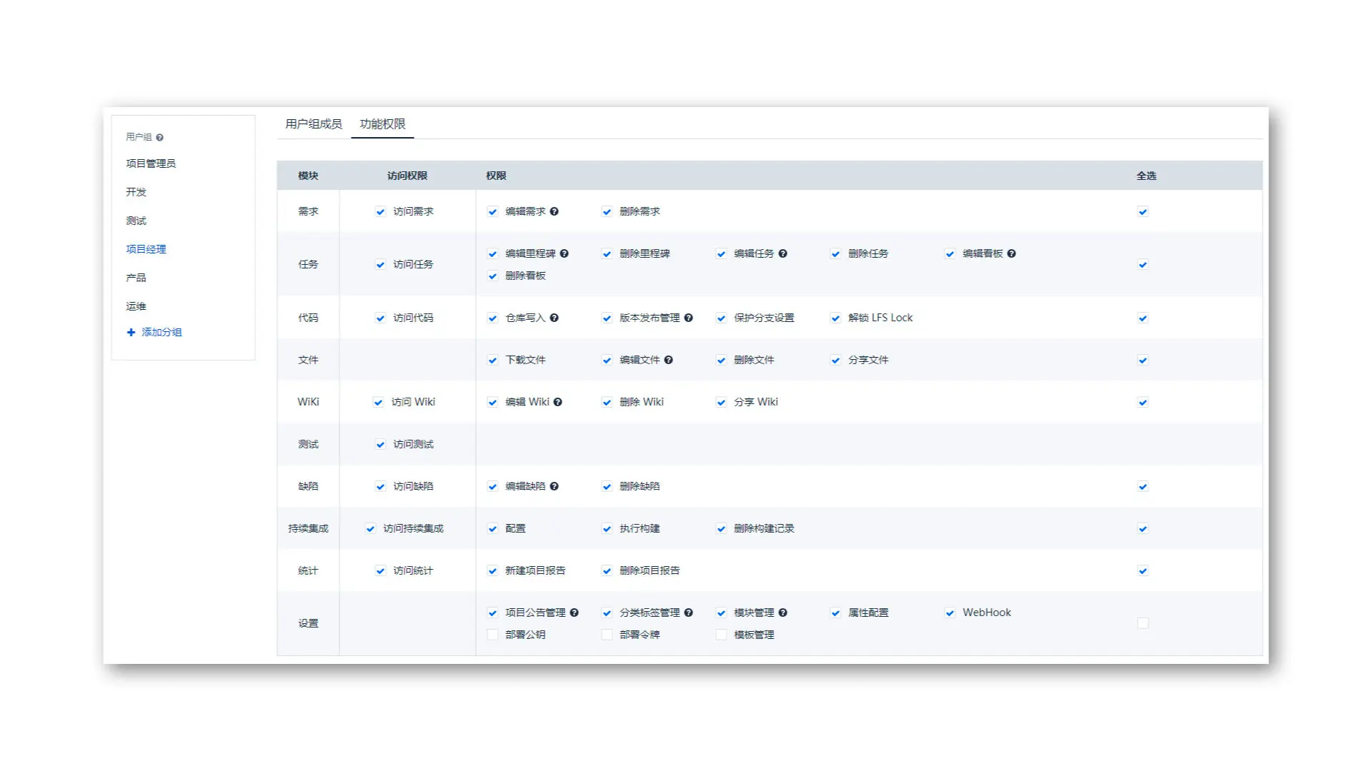 项目内权限管理支持自定义配置用户组和权限,项目管理员可根据团队实际情况进行灵活配置。