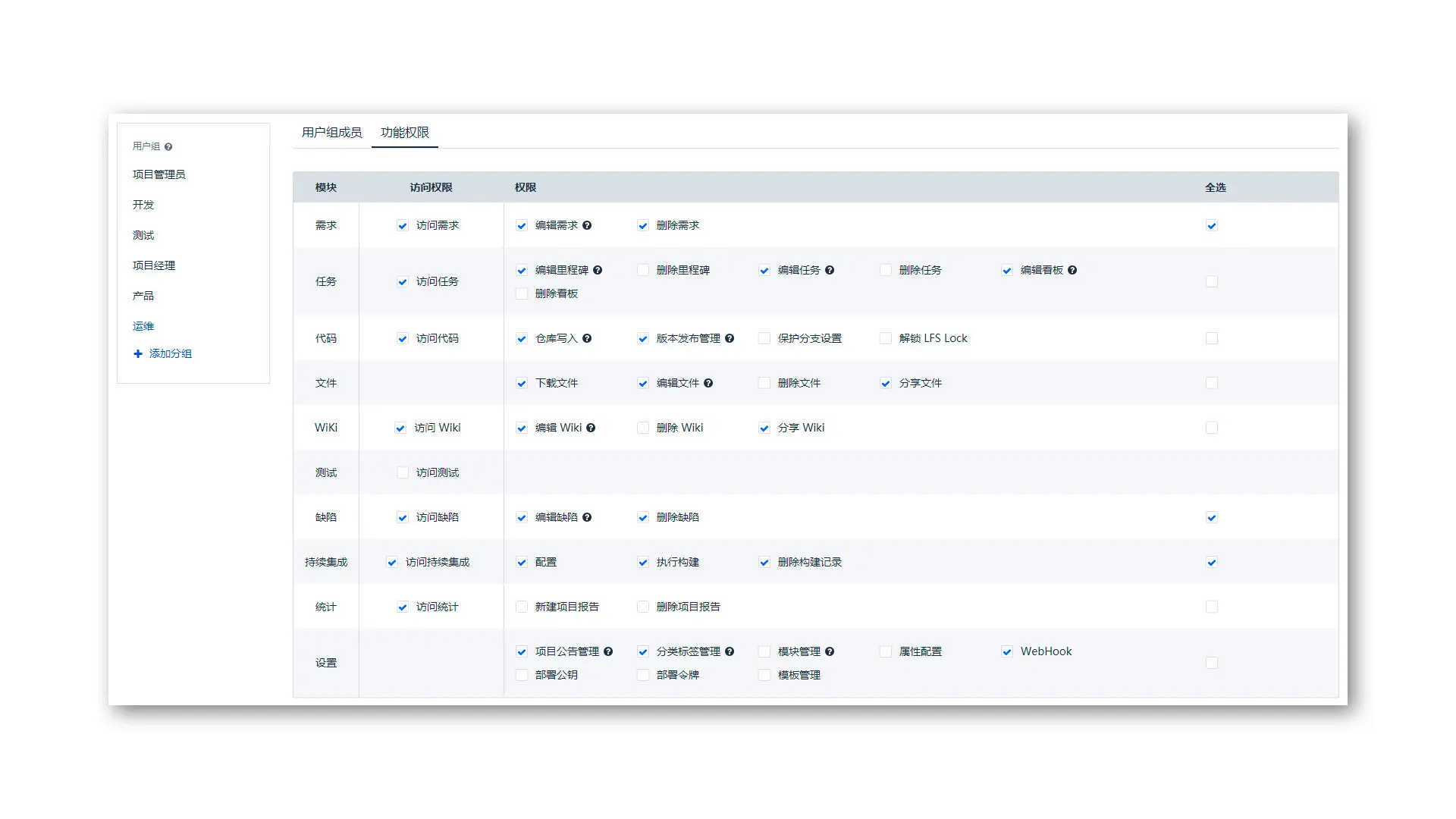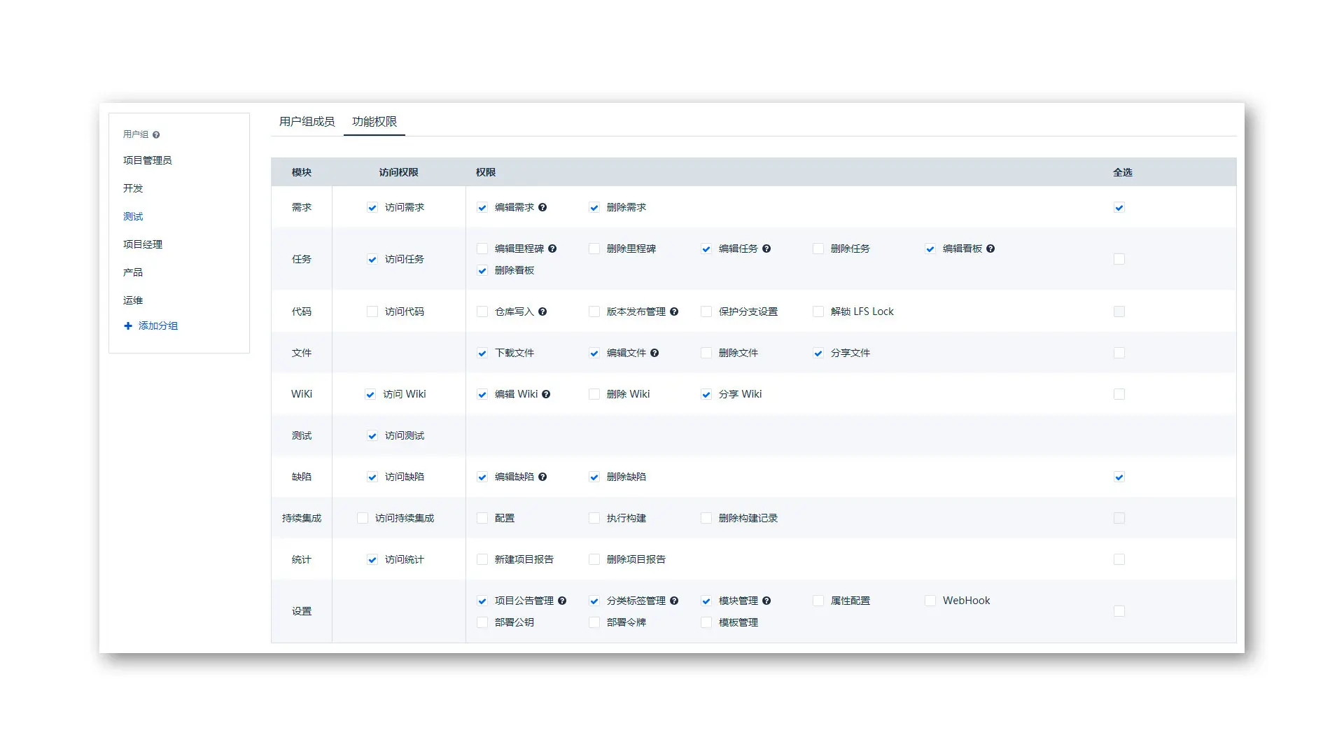 在权限列表中勾选该用户组成员的对应权限并保存,该用户组成员在刷新页面后即可生效新权限。