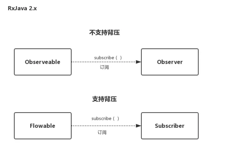 不支持背压:被观察者是主动的推送数据给观察者,观察者是被动接收的。