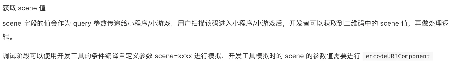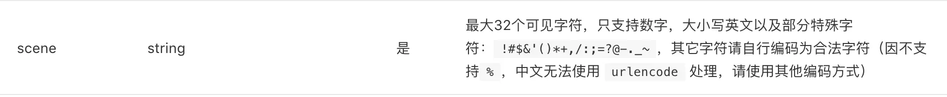 重点看下 scene : 最大32个可见字符,有页面路径带参数的情况下要尤其注意!!!