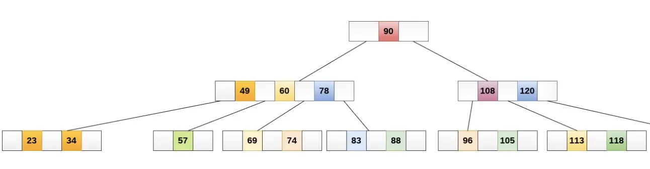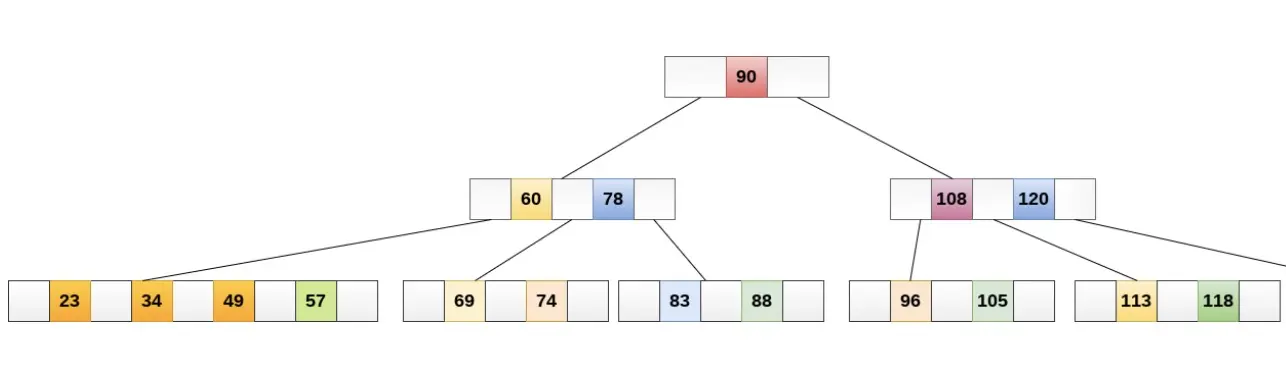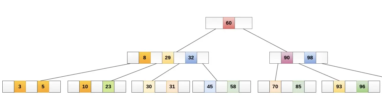 B树的搜索和二叉搜索树类似。从根节点开始,从上到下递归的遍历树。在每一层上,搜索的范围被减小到包含了搜索值的子树中。子树值的范围被它的父节点的键确定。