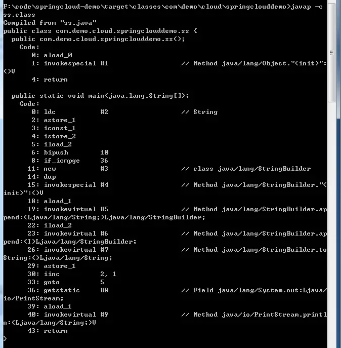 可以大概看出在11行的时候new了一个java.lang.StringBuilder的对象,其他就是一些操作数栈到变量,变量到操作数栈的赋值过程。想要看懂相应字节码代表的意思,可以参考文章: