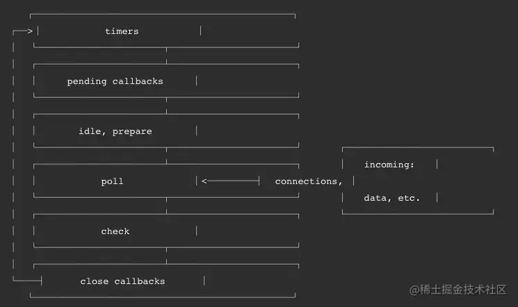Node 中的 Event Loop和浏览器中的是完全不相同的东西。Node.js采用V8作为js的解析引擎,而I/O处理方面使用了自己设计的libuv,libuv是一个跨平台、专门写给nodejs的库,使用异步,事件驱动的编程方式,核心是提供I/O的事件循环和异步回调。封装了不同操作系统一些底层特性,对外提供统一的API。