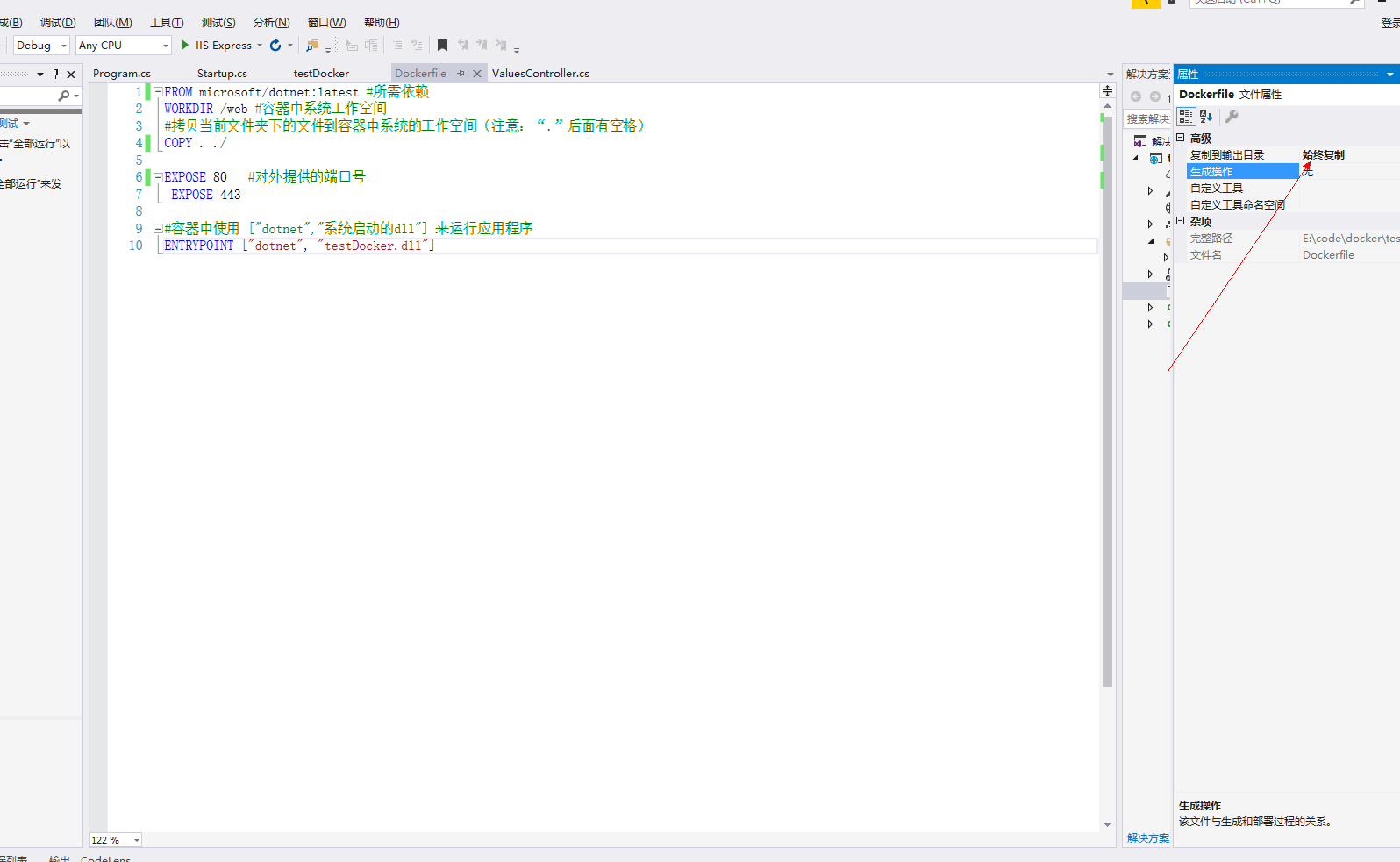 项目右键=》添加=》docker支持,添加成功之后会生成一个dockerfile文件,打开该文件,系统自动生成了一堆代码,但是在发布的时候发现不可用,因此从网上找了下面这种方式进行发布,把dockerfile属性改为始终复制,发布文件的时候直接把dockerfile文件也一块发布,如下图配置的dockerfile文件: