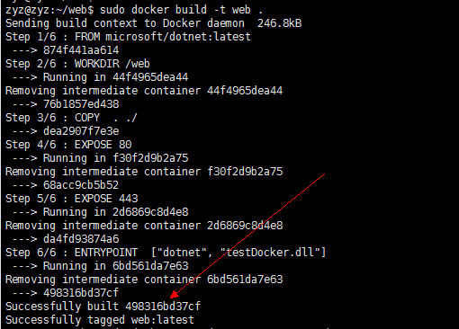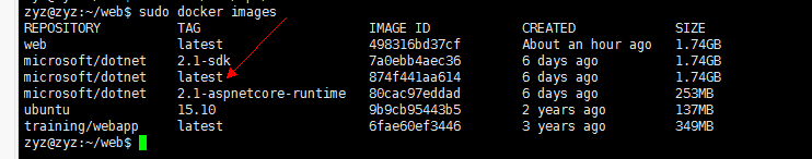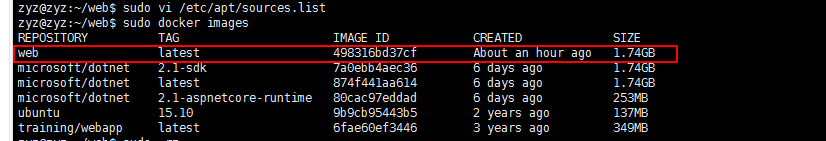 build之后就可以查看镜像列表:sudo docker images,下图中web 就是我们刚才所生成的镜像文件: