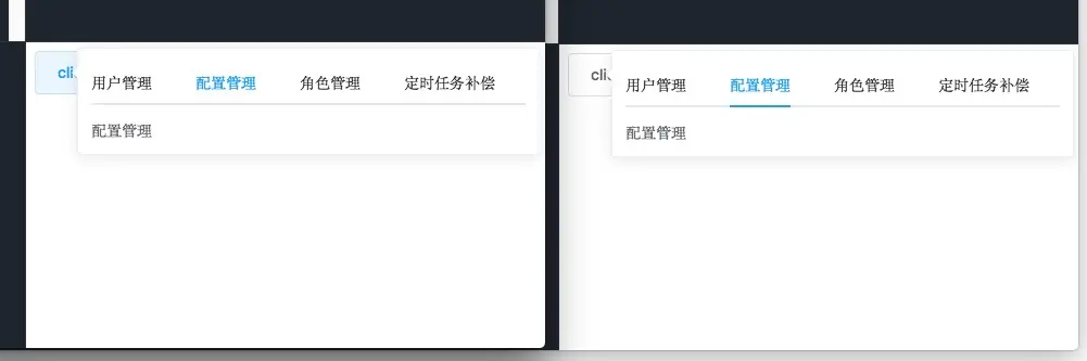 产品的原意应该是让我用dialog对话框来做,但笔者觉得对话框太重了,想用一个更加轻量的组件popover。看了下官方文档,官方已经给出了popover中嵌套table的demo,ctrl+c、ctrl+v,美滋滋。自己只需要在官方demo的基础上再加个el-tabs组件就可以了。代码写完了一跑,发现el-tabs组件的tab-bar没显示出来。下图左边是实际展示效果,右边是正常应该展示的效果。