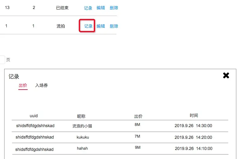 笔者最近在写一个管理后台的项目,技术栈选的是vue+element-ui。有一个需求是在一个表格的操作栏中点击按钮展示出价记录和入场券记录,如下图所示