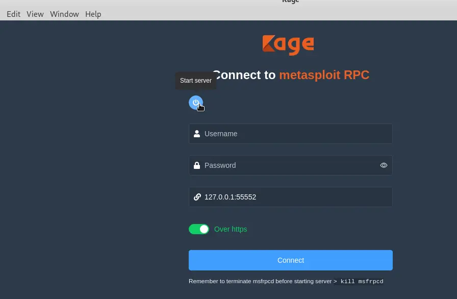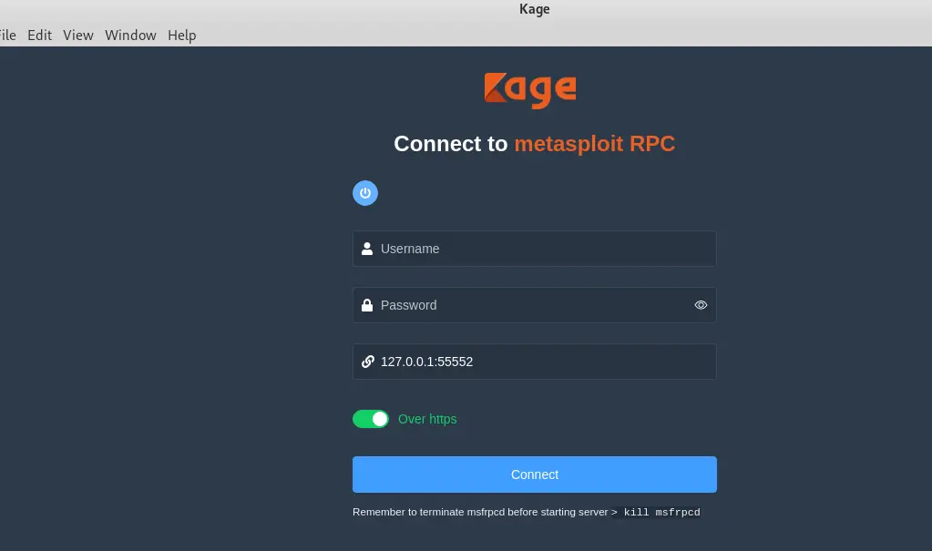 Kage是Metasploit RCP 服务器的GUI 工具,它可以帮助初学者更好的理解和学习Metasploit。该工具还处于开发中,支持的功能有限,要使用它需要安装Metasploit和npm。