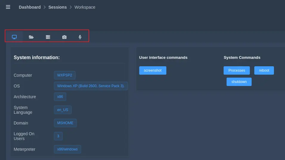 点击Interact可以进行会话交互,进去之后,第一个显示的是系统信息,右侧还有一些系统命令,比如查看系统进程,重启,关机。