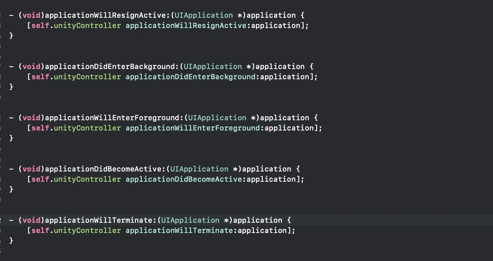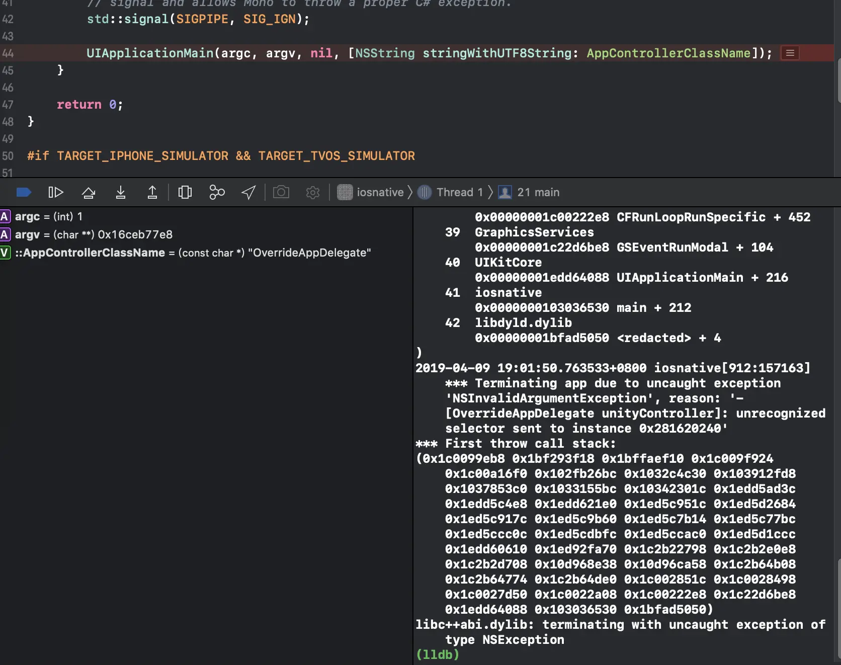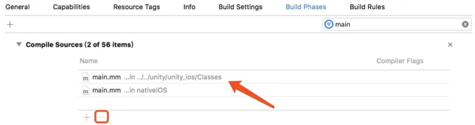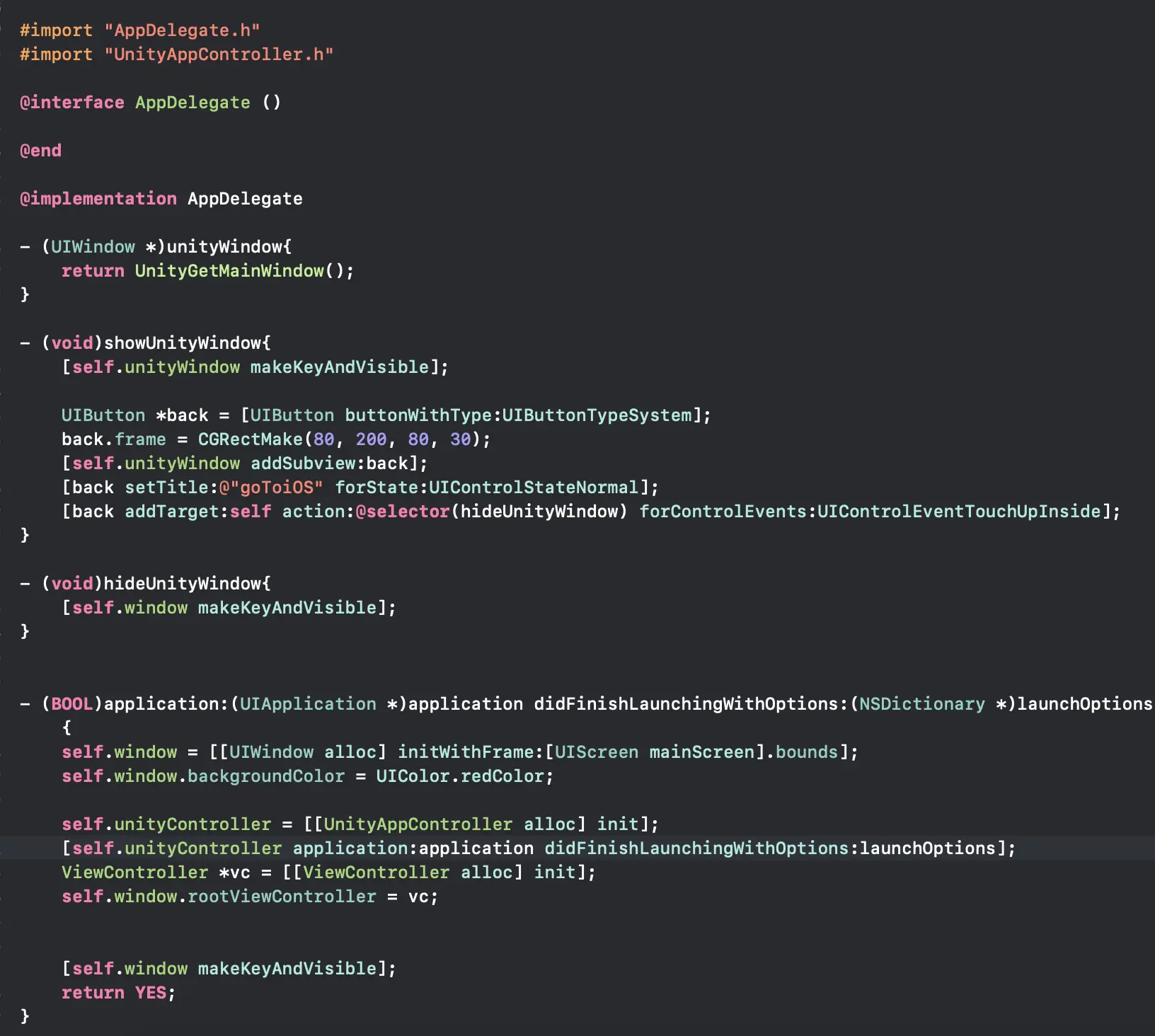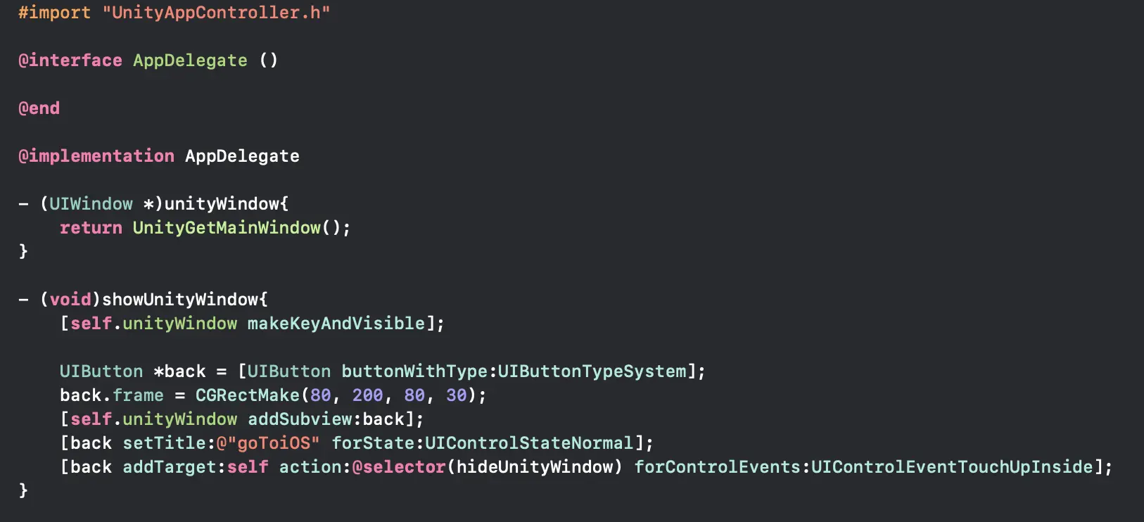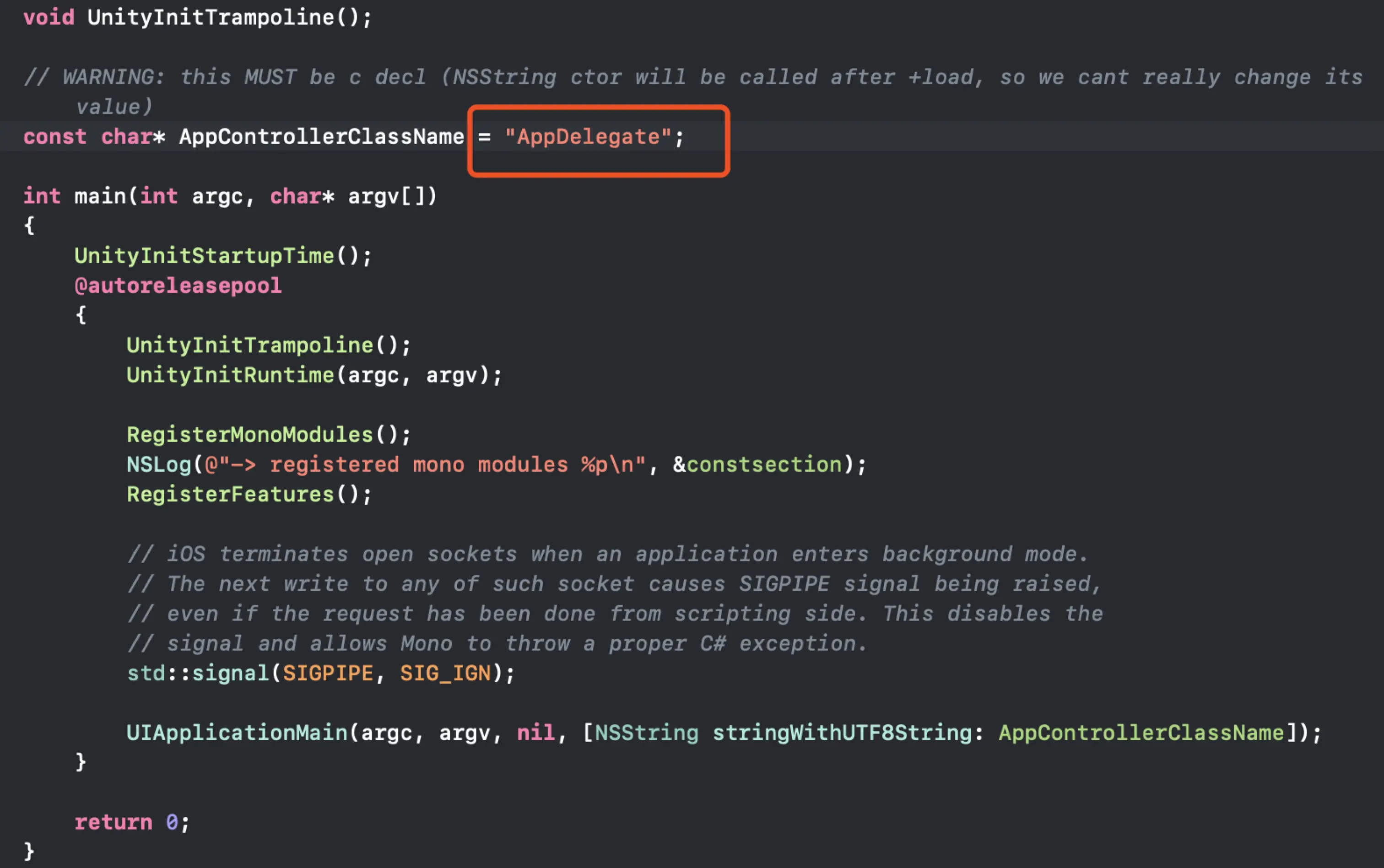 Classes文件夹下的main.mm中全部代码复制到Xcode生成的main.m中;将main.mm代码中的"UnityAppController"修改成"AppDelegate";