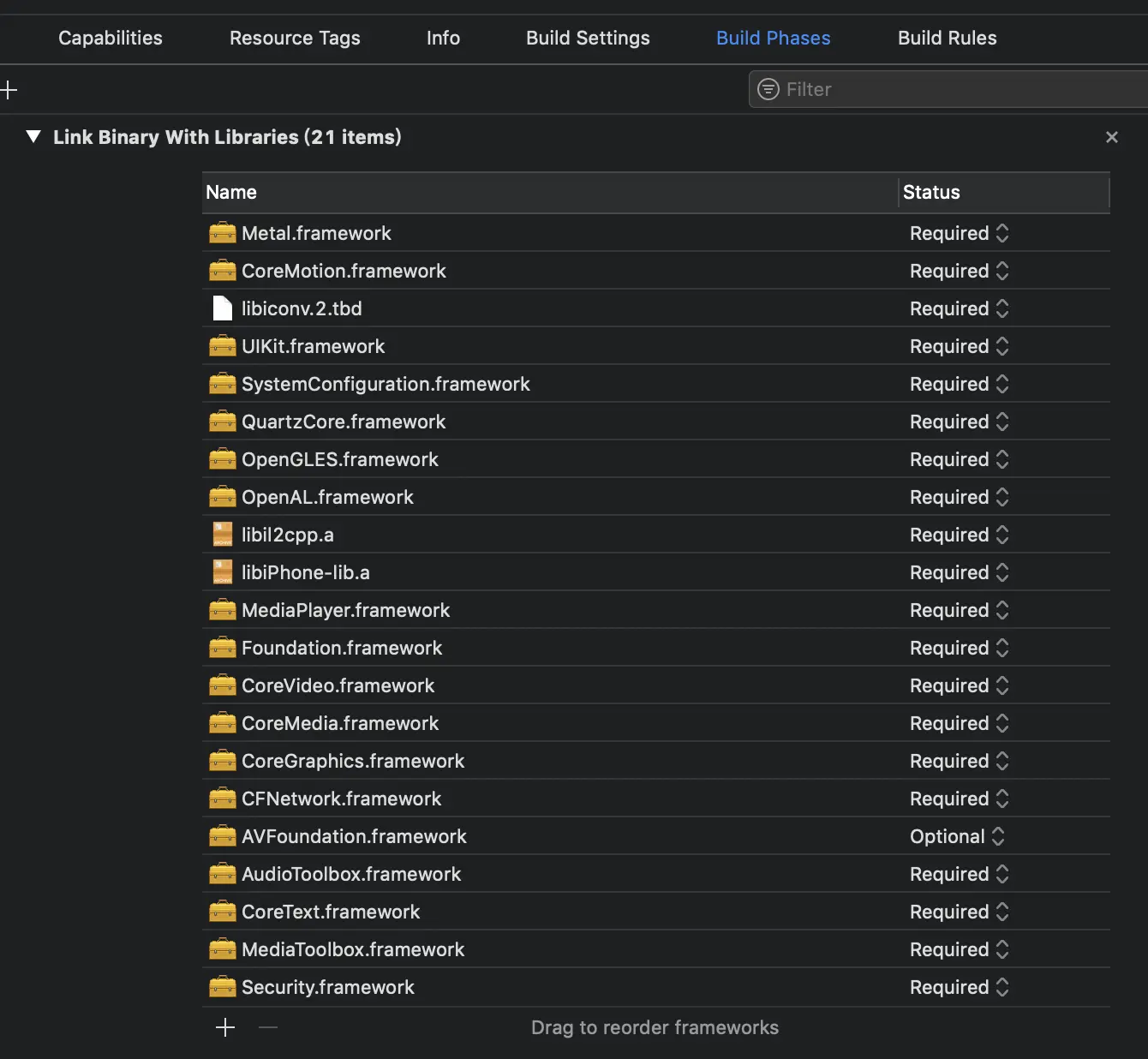 步骤五:在Target->Build Phases中导入以下库(建议以自己Unity导出的Xcode项目对应添加):