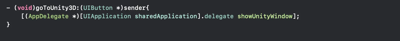 a.iOS界面切换到Unity界面; 在ViewController.m中创建一个button,点击触发方法如下:
