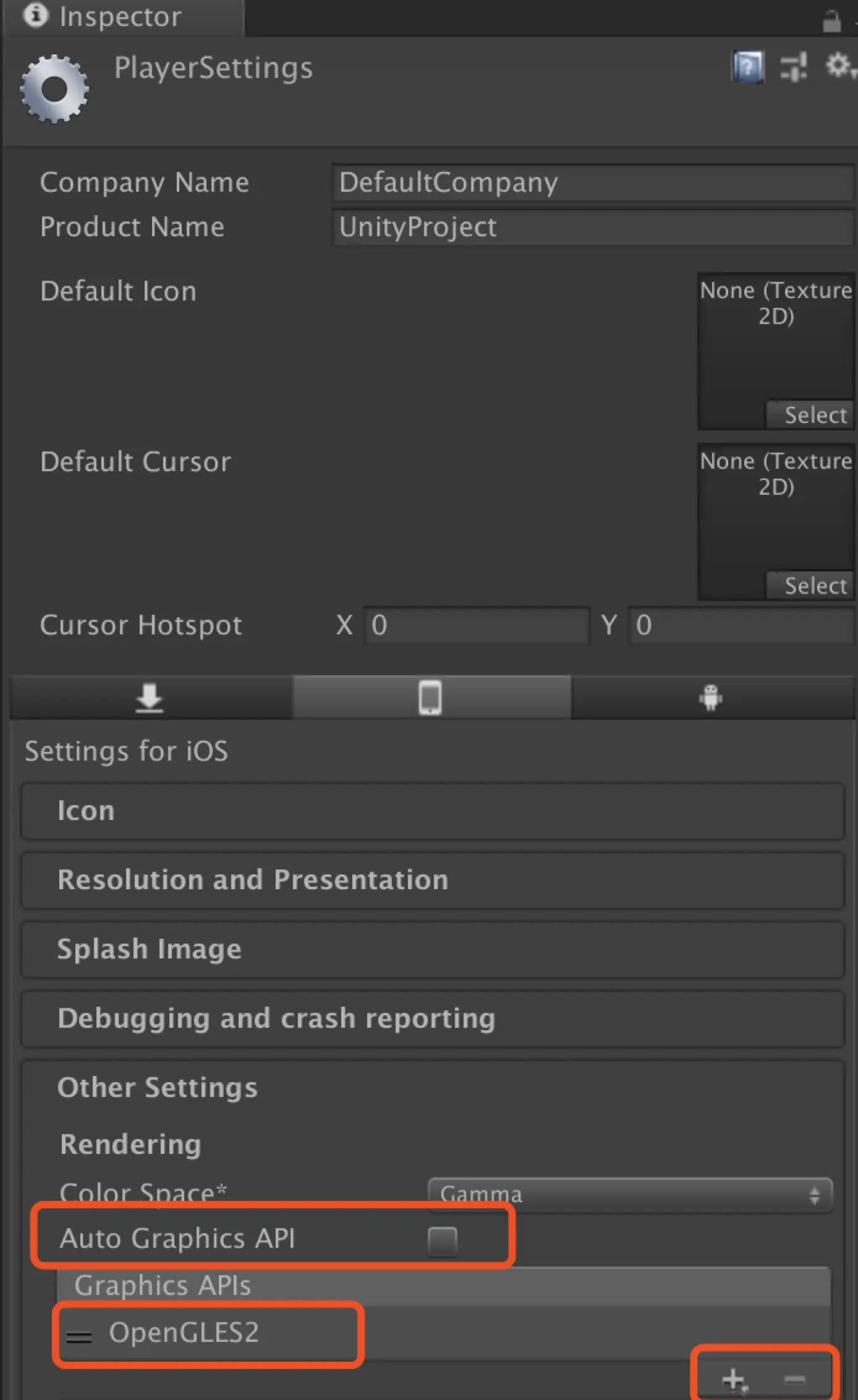 1.取消Auto Graphics API的勾选并移除Metal选择OpenGLES2(补充:取消勾选,选择Metal也能成功,根据相关报错信息自行修改)