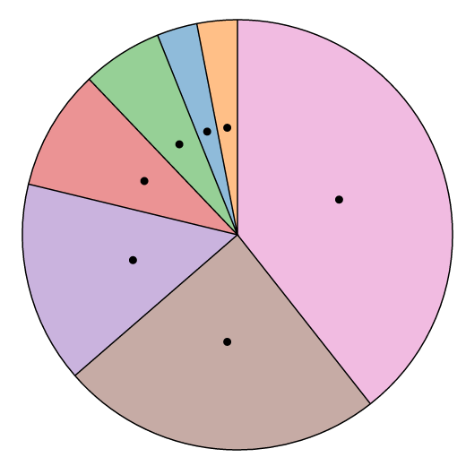 接下来给饼图加一些标注,以便更好地阅读图形,主要用到弧中心的概念,如下图,黑点就是每个弧的中心,利用**arc.centroid()**可以获取弧中心的坐标,并且这个坐标是相对圆形的相对坐标。有了这个坐标,可以很方便地在每个弧上添加文字标注