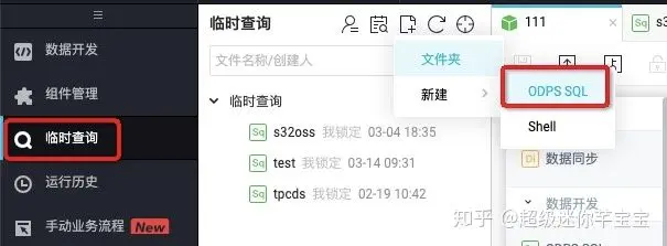 步骤1 在左侧tab也中找到临时查询,并右键>新建ODPS SQL节点。