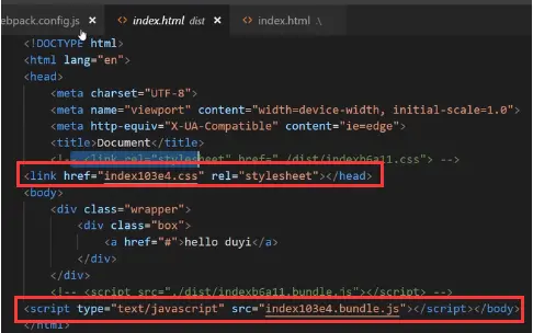 然后,我们就要手动的把html中引入的两个文件名都修改成带hash的名字,这样的话,每次打包名字改变,引入就需要修改,很麻烦,也不科学