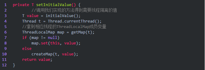 map为null或e为null就会走到setInitialValue,如果我们是第一次get()方法,那map会是空的,所以接下来先看setInitialValue()方法