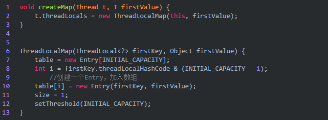可以看到在new ThreadLocalMap之后,就会创建一个Entry加入到数组中,最后把ThreadLocalMap的引用赋值给Thread的threadLocals成员变量