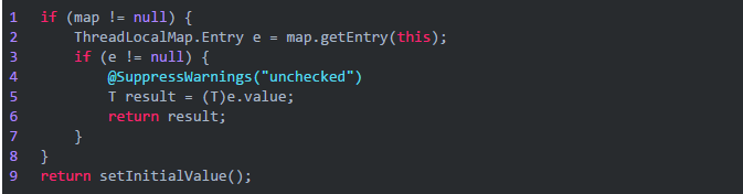 上面先取到当前线程,然后调用getMap方法获取对应的ThreadLocalMap,ThreadLocalMap是ThreadLocal的静态内部类,然后Thread类中有一个这样类型成员,所以getMap是直接返回Thread的成员