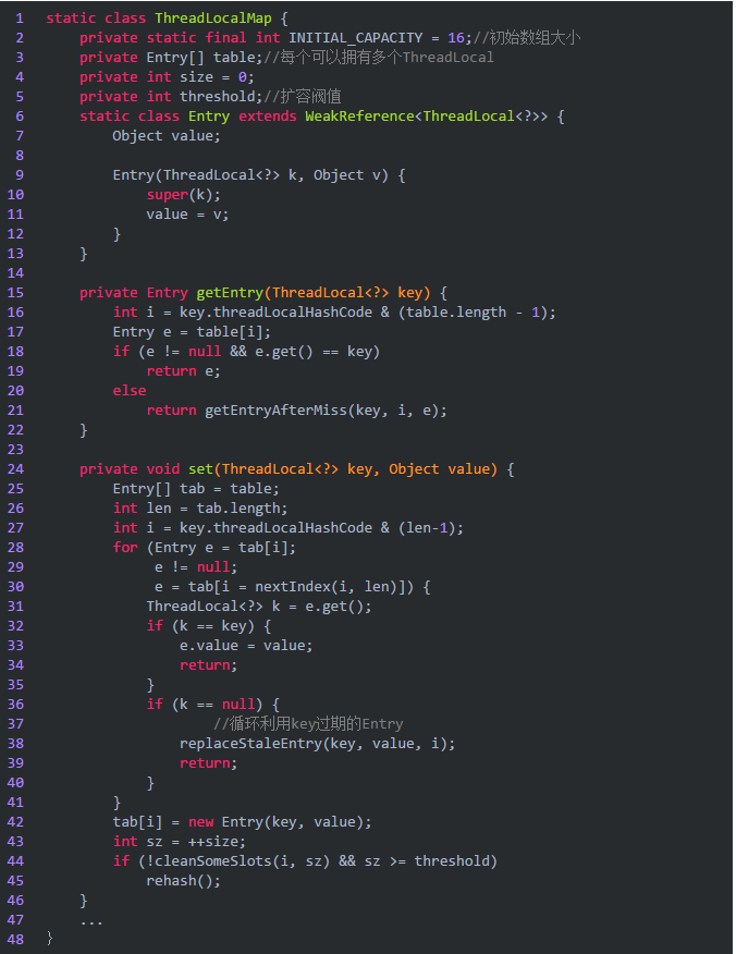 可以看到有个Entry内部静态类,它继承了WeakReference,总之它记录了两个信息,一个是ThreadLocal<?>类型,一个是Object类型的值。getEntry方法则是获取某个ThreadLocal对应的值,set方法就是更新或赋值相应的ThreadLocal对应的值。里面涉及到扩容策略、Entry哈希冲突、循环利用等等不再深入,留个大致印象就好。