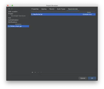 然后点击菜单File/Project Structure...,找到flutter_text_plugin的Dependencies中,将flutter库的Scope从Implementation改成Compile Only。