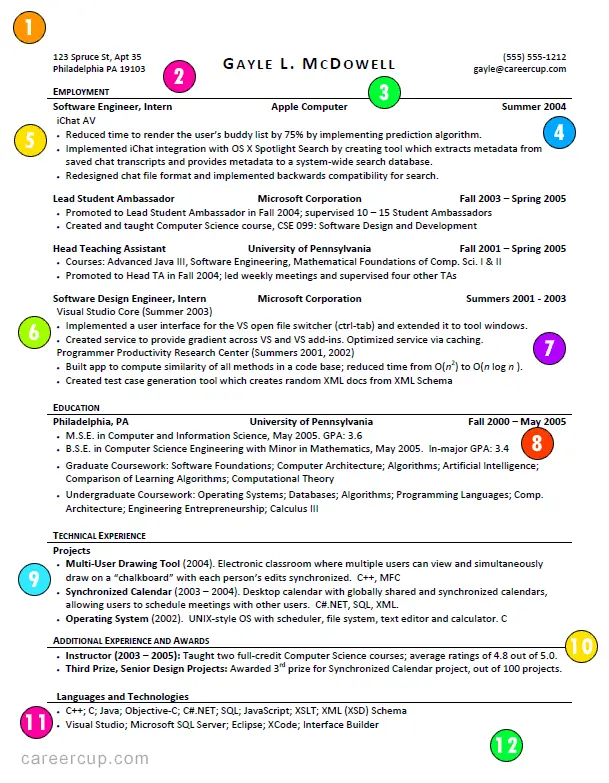Although the example here is a developer resume, almost all of these points (everything but #9 and #11) apply to other positions as well.